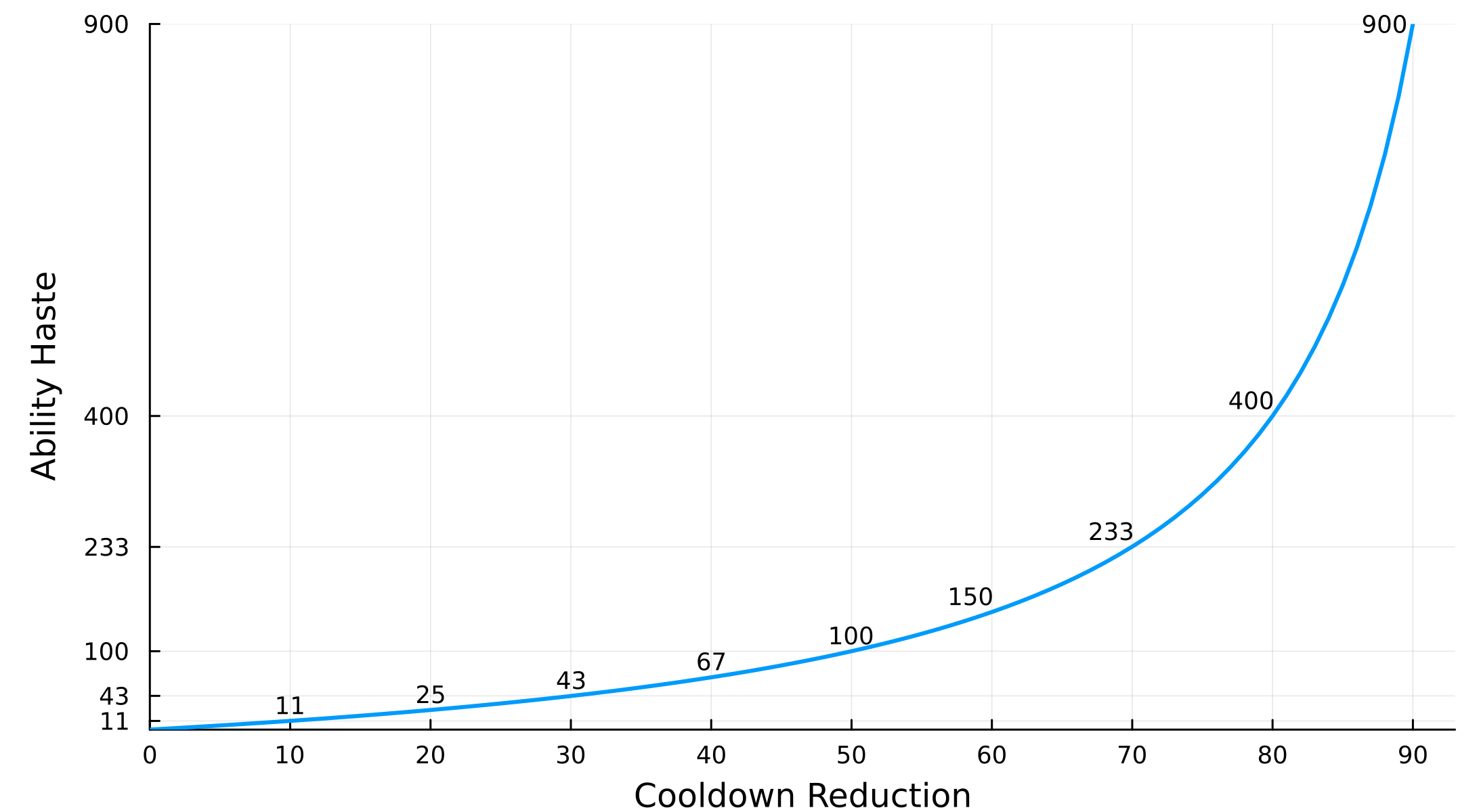 From the shape of the graph, you can see that the required Ability Haste increases exponentially with the target reduction. For example, achieving a $50\%$ cooldown reduction requires $100$ Ability Haste, whereas achieving $90\%$ reduction requires a staggering $900$ Ability Haste. This is a system designed to prevent attaining abnormally high cooldown reductions.
