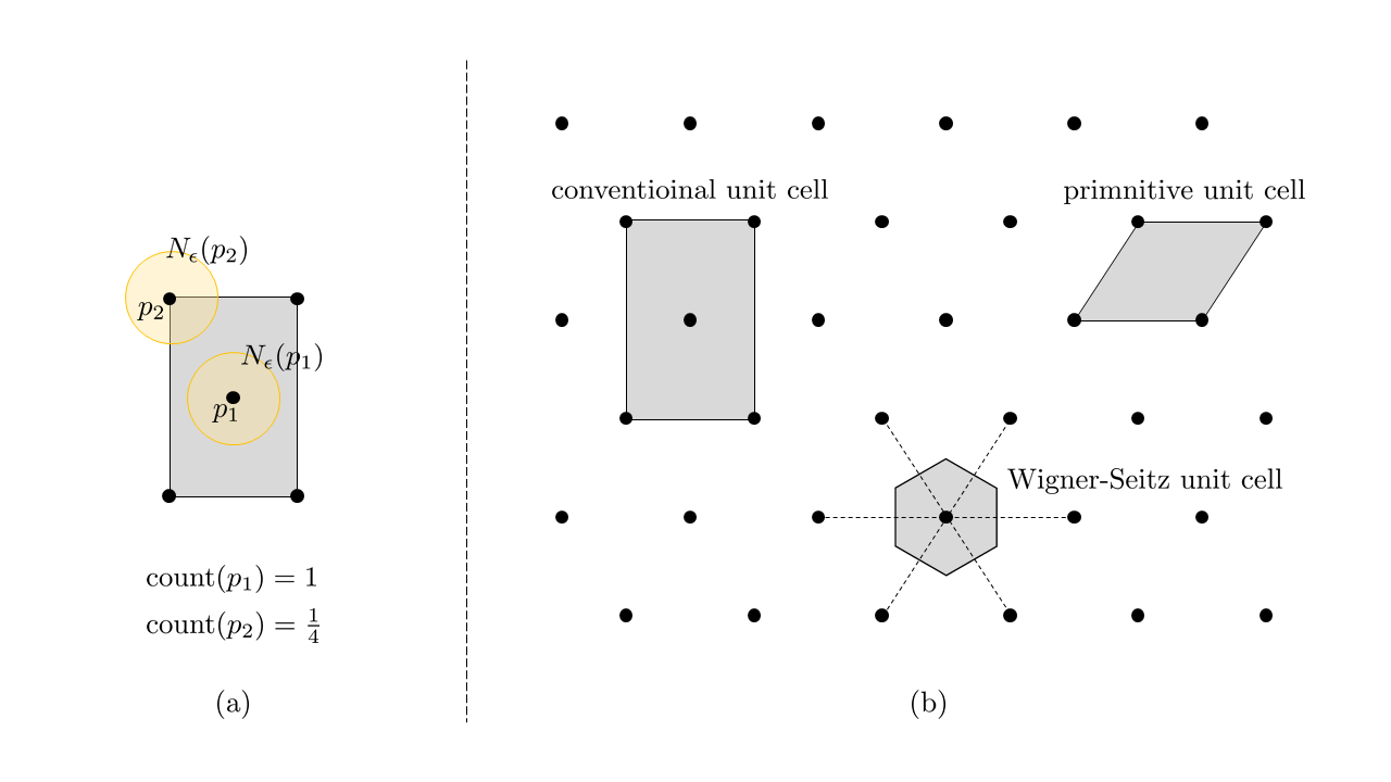 By contrast, points lying on the boundary of the unit cell, for example a point like $p_{2}$, do not admit any neighborhood that is entirely contained in the unit cell for any choice of $\epsilon$. In such a case the count of $p_{2}$ is less than $1$. Concretely, for a sufficiently small neighborhood, the ratio of the volume of the intersection between the neighborhood and the unit cell to the volume of the neighborhood is $\frac{1}{4}$, hence this lattice point contributes $\frac{1}{4}$ lattice points to the unit cell. Therefore the unit cell in $(a)$ contains a total of $1 + 4\cdot\frac{1}{4} = 2$ lattice points. Alternatively, if when filling the entire lattice by translations of the unit cell a lattice point is shared among $n$ unit cells, one can understand that the lattice point should be counted as $\frac{1}{n}$.