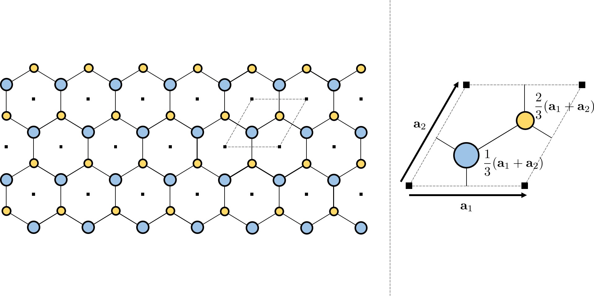 Any complex crystal structure can be described using a lattice, a unit cell, and a basis. The lattice represents the macroscopic repeating pattern of the crystal, whereas the basis describes how atoms are locally arranged. A good example to understand this is the honeycomb structure. Although the honeycomb is, contrary to intuition, not a lattice by definition, it can be represented by a lattice plus a basis. Here the set of black dots inside the hexagons forms the lattice, the dotted region is the unit cell, and the blue and yellow points are represented within the unit cell by coordinates $(\frac{1}{3}, \frac{1}{3})$ and $(\frac{2}{3}, \frac{2}{3})$ respectively; these two coordinates make up the basis.