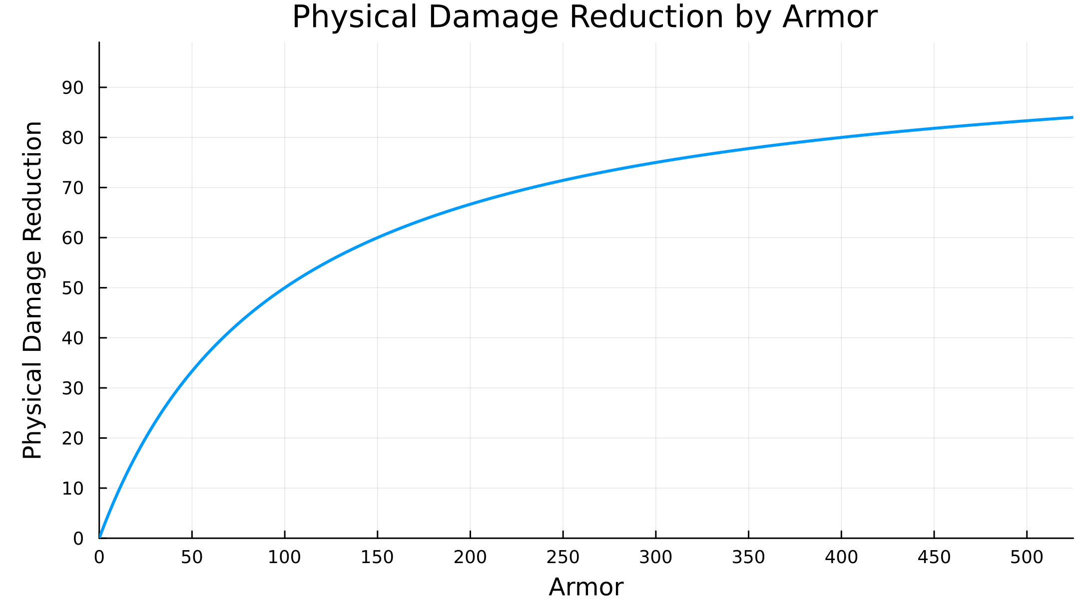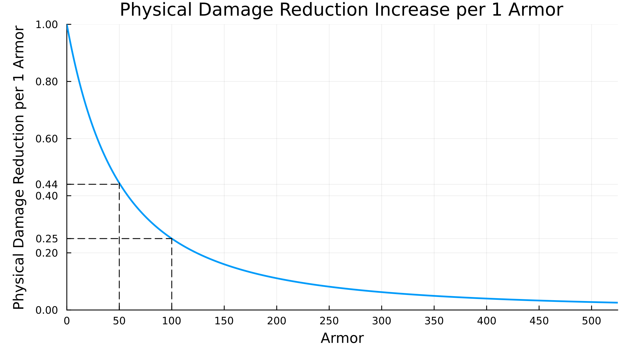 これは $y = \dfrac{1}{x^2}$ 型の有理関数であり、分母に二乗項が含まれているため防御力が増加するにつれて物理ダメージ軽減率の増加幅は急速に減少する。最初は防御力がそのままダメージ軽減率に等しく変換されるが、防御力が $50$ に達する前に、防御力が物理ダメージ軽減率へ変換される割合は半分以下に落ちる。防御力が $100$ になると、物理ダメージ軽減率への変換割合は $25\%$ に落ちる。