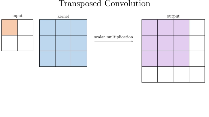 一般に畳み込みはプーリング層と共に使用され、入力データの次元を削減し情報を圧縮するのに使われる。一方で転置畳み込みは圧縮データの次元を増加させ、アップサンプリングupsamplingを行うのに使用される。基本的にカーネルを移動させながら入力画像と計算結果を得ることは畳み込みと同じである。畳み込みは画像の一部領域とカーネルの内積を出力するのに対し、転置畳み込みは画像のピクセルひとつとカーネルのスカラー乗算scalar multiplicationである点が異なる。また、畳み込みでは入力データがカーネルと計算される領域が重なるが、転置畳み込みではカーネルと計算された出力データの領域が重なる。計算方式は以下のGIFに詳しく示されている。