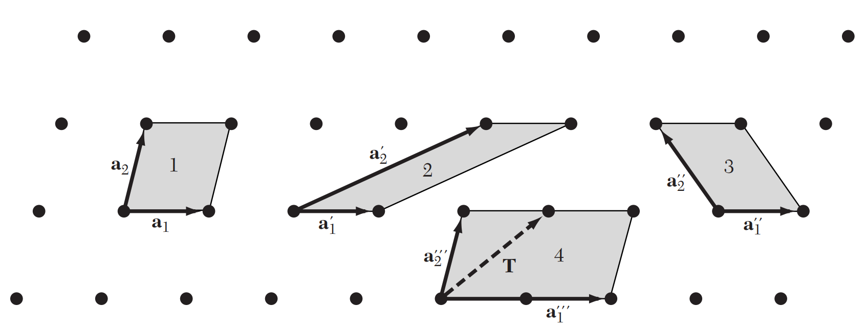 결정구조는 원자들의 배열이 반복되는 것이므로 수학적으로 쉽게 표현할 수 있다. 정의 $(1)$은 3차원 공간을 기준으로 기술되었지만, 2차원 혹은 1차원에서의 격자 역시 같은 방식으로 정의된다. 기본격자벡터는 기본기저벡터primitive basis vector 혹은 기본병진벡터primitive translation vector라고도 불린다. 아래 그림3에서 보이듯이 같은 격자에 대해서 기본 격자 벡터 $\mathbf{a}_{i}$들은 유일하지 않다.
