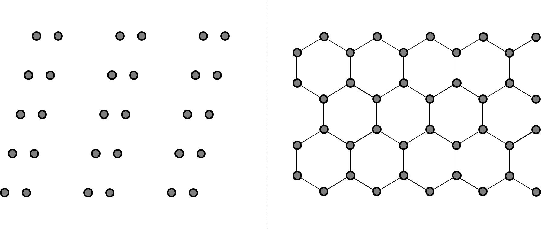 하지만 결정 구조를 표현하기에는 격자만으로 모자라다. 가령 아래 왼쪽 그림이나 오른쪽의 벌집구조와 같은 경우에는 분명히 같은 배열이 반복되지만, 점들이 격자의 정의에 부합하지 않는다는 걸 알 수 있다. 그래서 임의의 복잡한 결정 구조를 표현하려면 🔒(26/03/30)단위 셀과 🔒(26/03/30)기저라는 개념이 필요하다.